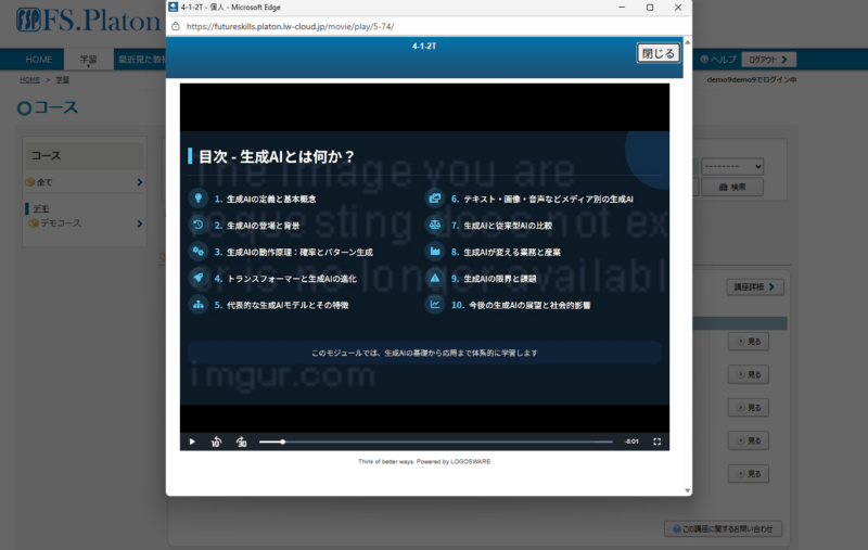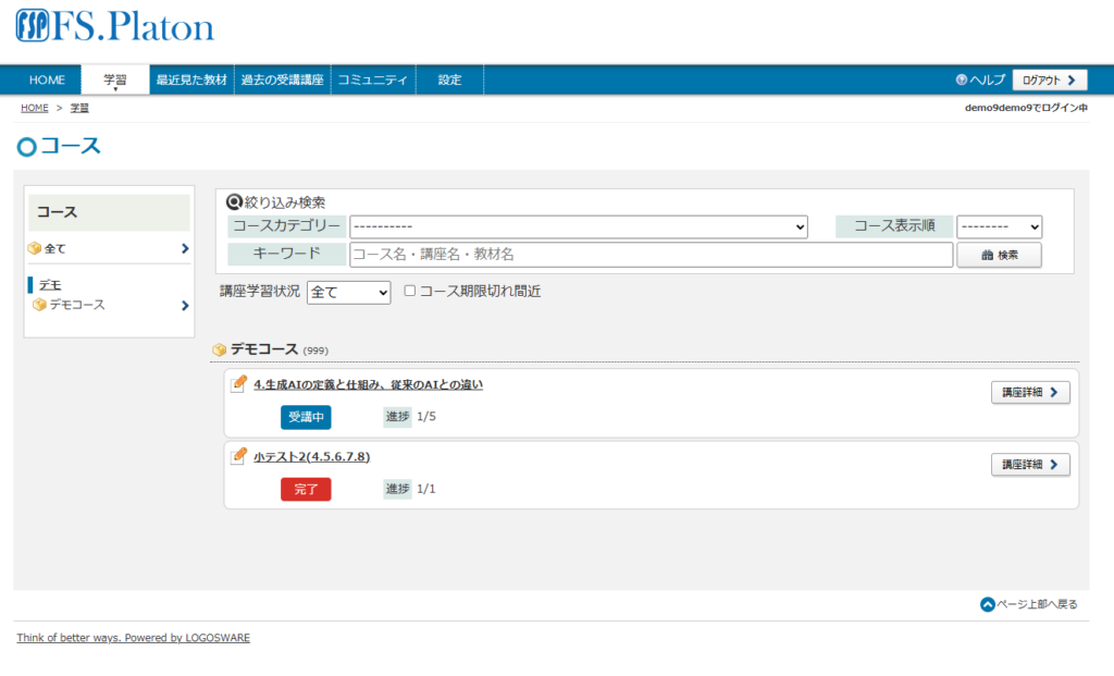 - 学習者はログインすると、自分の受講コースと進捗状況が一目で確認可能